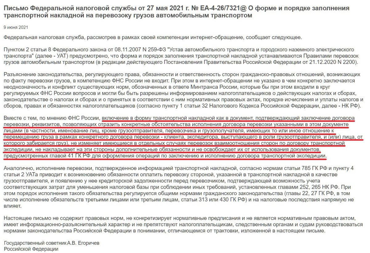 Обратите внимание: указание в транспортной накладной экспедитора не устраняет его обязанности по оформлению предусмотренных Правилами транспортно-экспедиционной деятельности документов (экспедиторской и складской расписок); об этом напоминала ФНС в письме от 27.05.2021 г. № ЕА-4-26/7321.